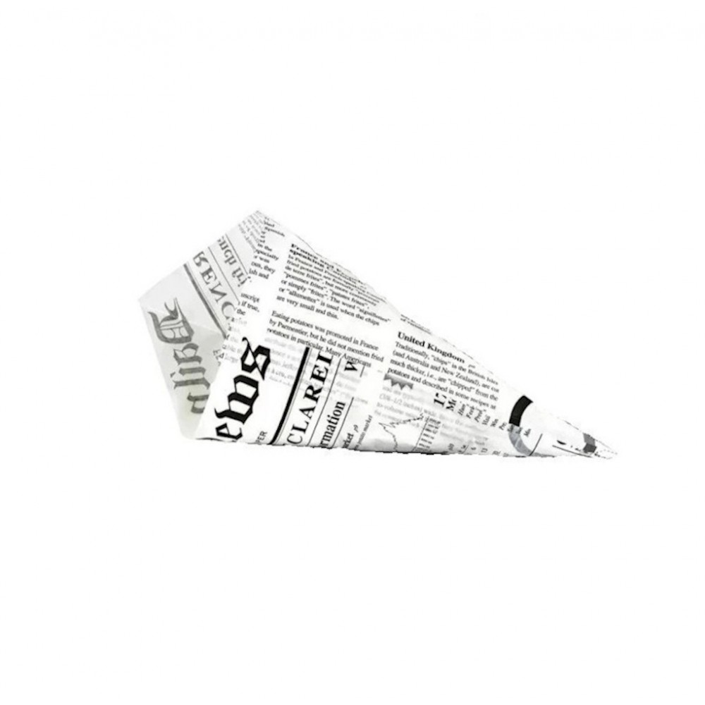 Etichete: conuri, cornete, albe, print ziar, rezistente garasimi, 42x30x30 cm, 960 ml, brutarie, patiserie, street food, evenimente, finger food, snack