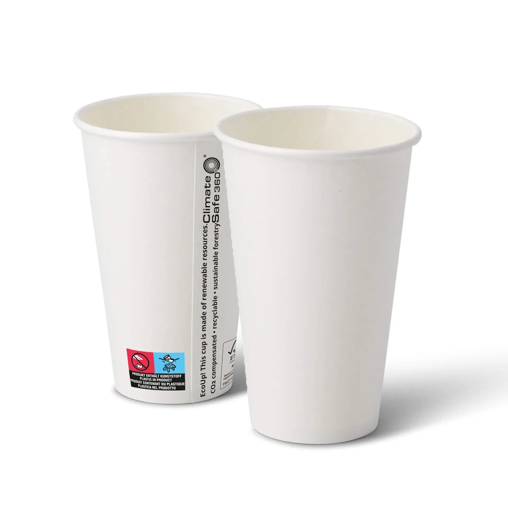 Culoare: alb, la imbinare pe verticala este inscriptionat mesajul: "EcoUp! This cup is made of renewable resources. CO2 compensated. recyclable. sustainable forestry. ClimateSafe360"; imprimata pictograma "plastic in produs"
