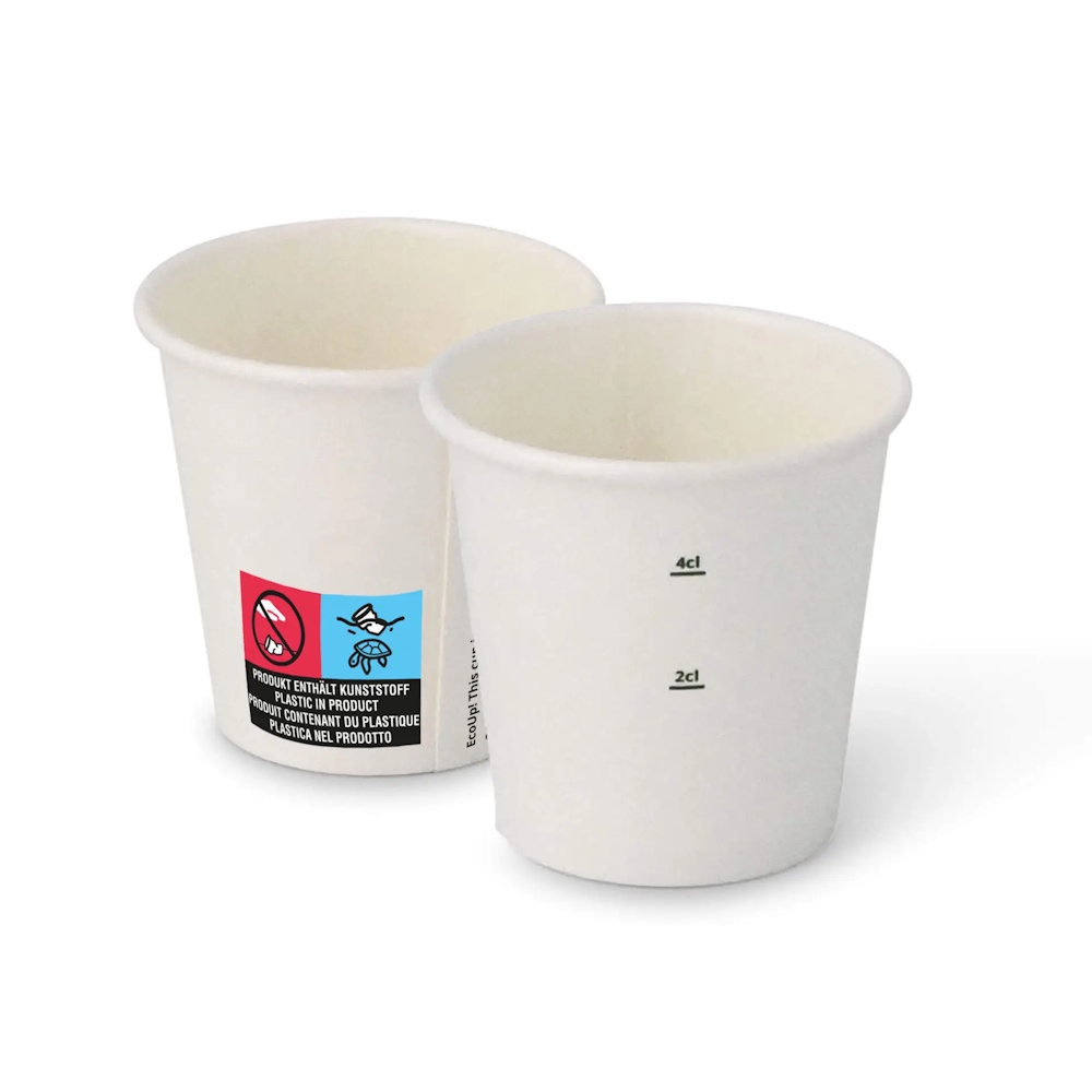 Culoare: alb, la imbinare pe verticala este inscriptionat mesajul: "EcoUp! This cup is made of renewable resources. CO2 compensated. recyclable. sustainable forestry"; imprimata pictograma "plastic in produs"